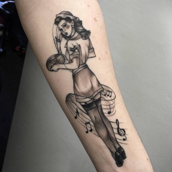 女孩人物纹身图案 女生手臂上黑灰的女孩人物纹身图片