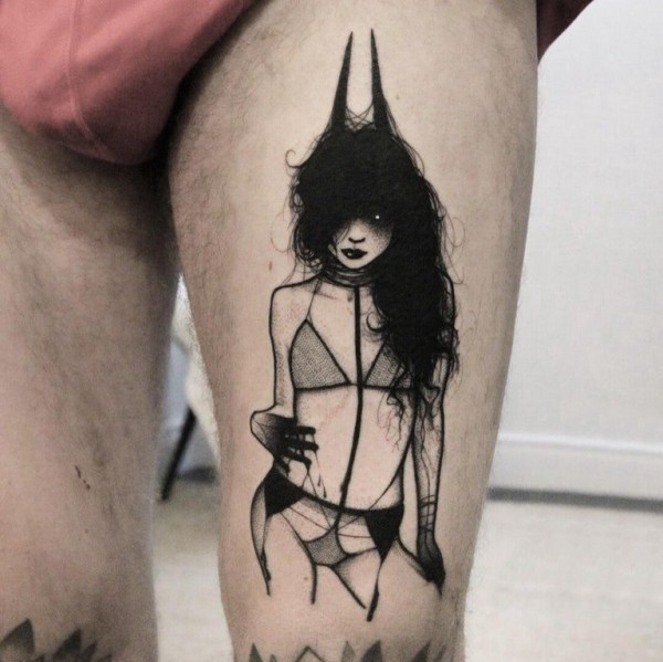 纹身模特 男生大腿上黑灰的模特纹身图片