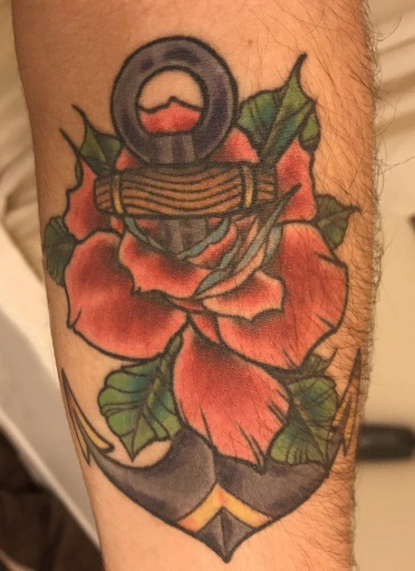 欧美船锚纹身 男生 手臂上船锚和花朵纹身图片