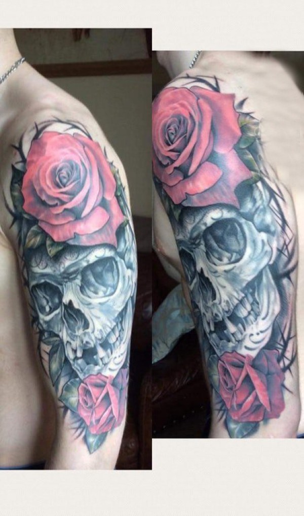 骷髅和花朵纹身图案 男生大臂上骷髅和花卉纹身图片