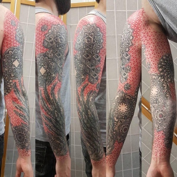 几何花臂纹身图案 男生手臂上彩绘几何花臂纹身图片
