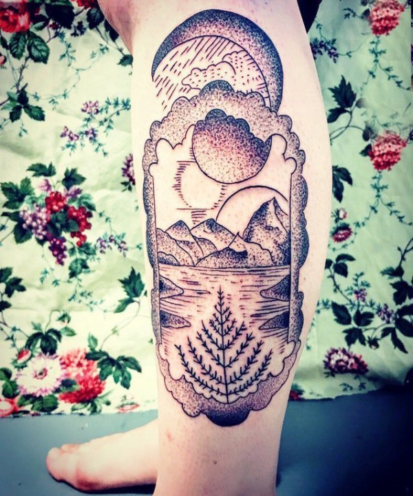 风景纹身 女生小腿上黑灰的风景纹身图片