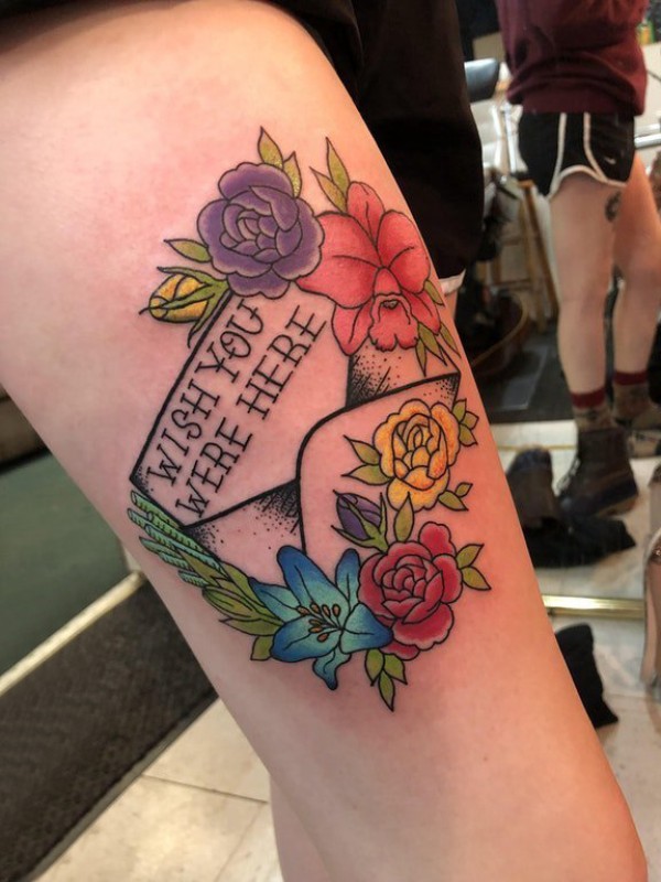 花朵和英文纹身图案 女生大腿上花朵和英文纹身图片