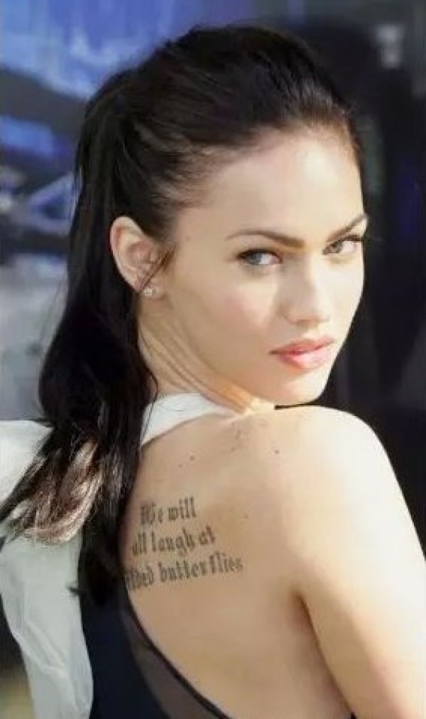 国际纹身明星 Megan Fox后背上黑色的英文纹身图片