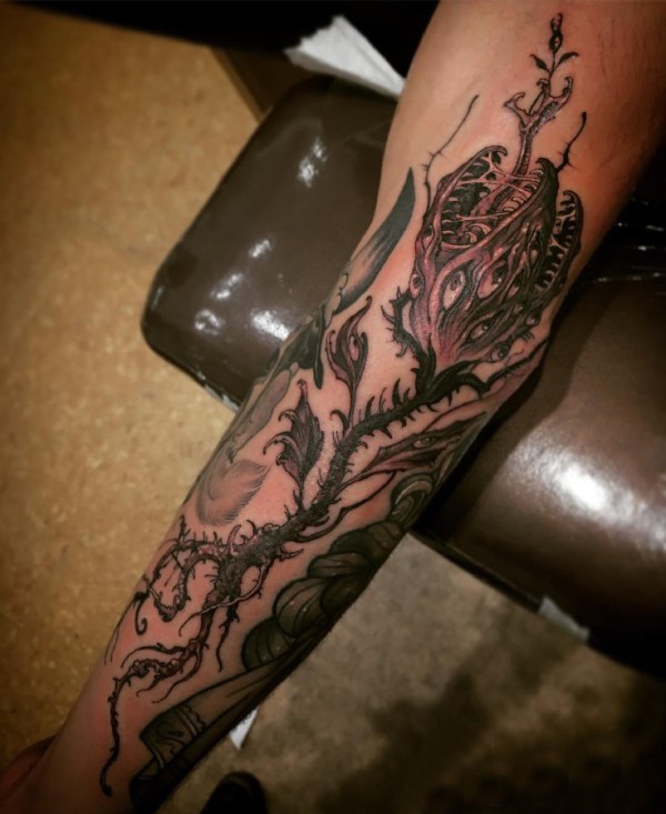 植物纹身 男生手臂上恐怖的食人花纹身图片