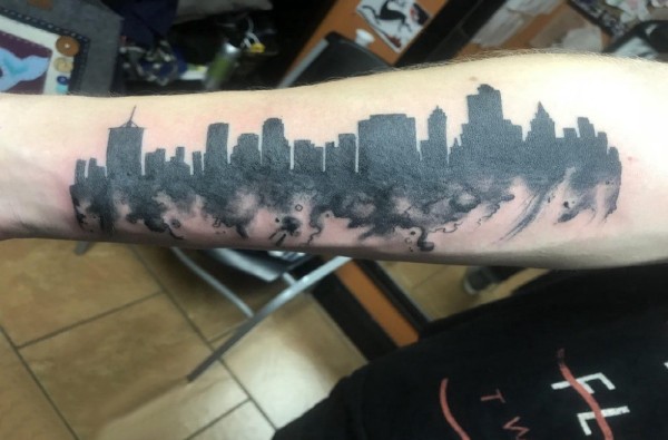 建筑物纹身 男生手臂上黑色的高楼大厦纹身图片