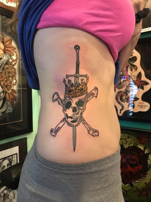骷髅和剑纹身图案 女生侧腰上骷髅和剑纹身图片
