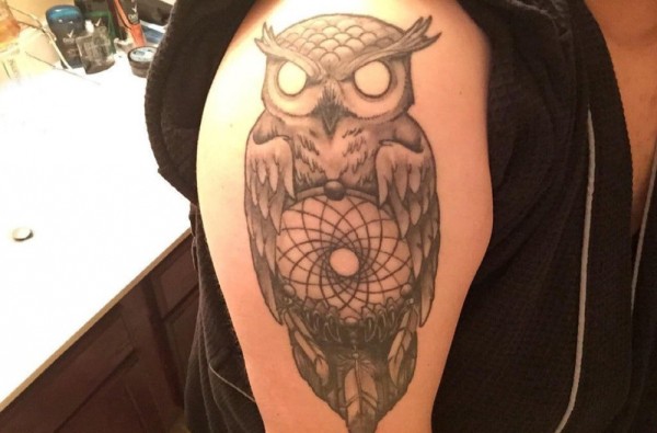 纹身猫头鹰 男生手臂上黑灰的猫头鹰纹身图片