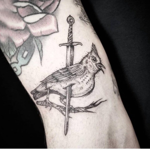 纹身鸟 女生手臂上鸟和剑纹身图片
