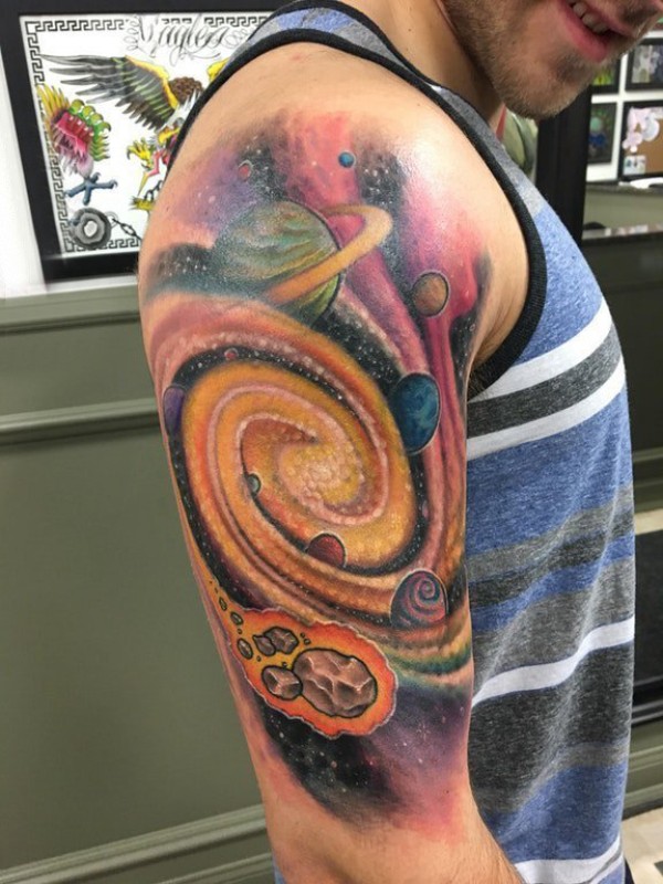 纹身星球 男生大臂上宇宙中的星球纹身图片
