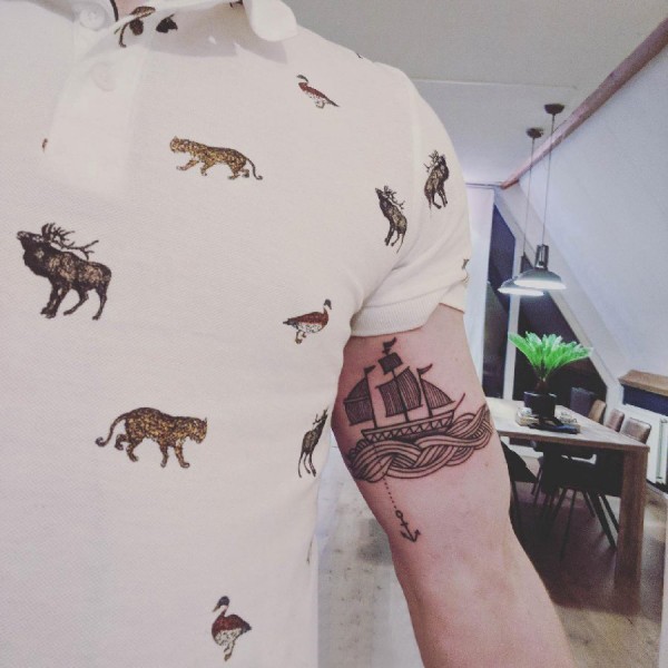纹身小帆船 男生手臂上黑灰的小帆船纹身图片