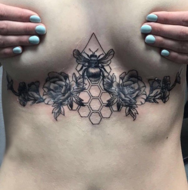 蜜蜂纹身图案 女生胸下蜜蜂和花朵纹身图片