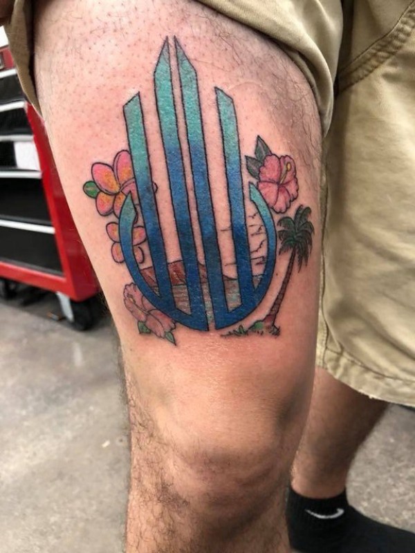 水瓶座纹身 男生大腿上符号和花朵纹身图片