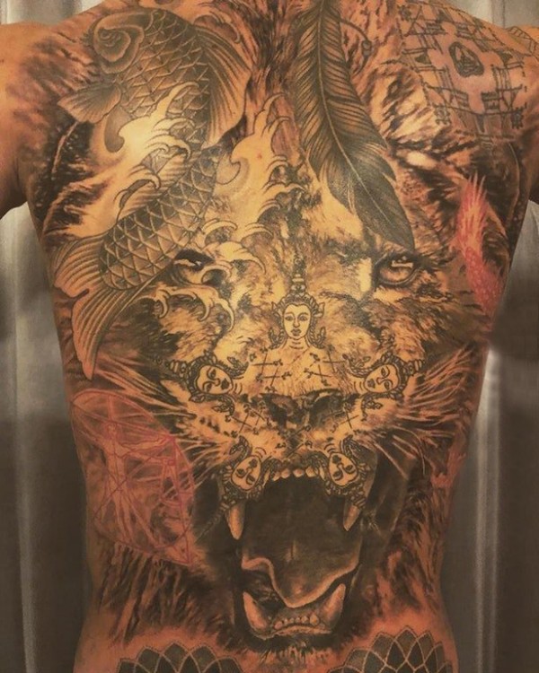 狮子王纹身 男生满背狮子和佛像纹身图片