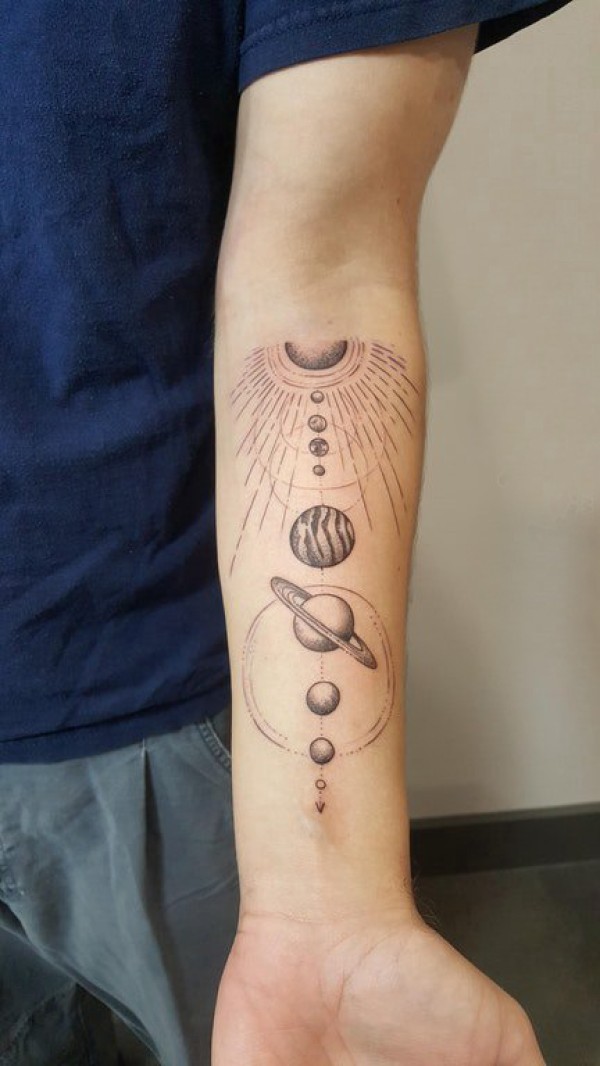 几何元素纹身 男生手臂上神秘的星球纹身图片
