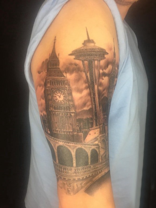 建筑物纹身 男生大臂上雄伟的建筑物纹身图片