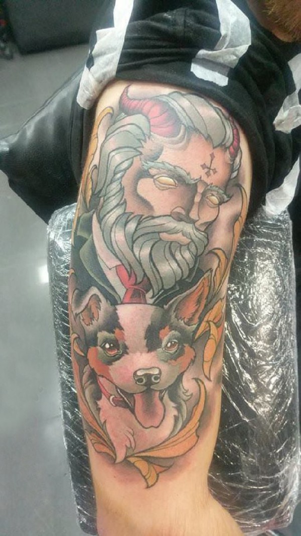狗的纹身图案 男生手臂上人物和狗纹身图片