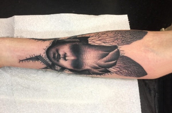 点刺纹身 男生手臂上黑灰色的点刺纹身图片
