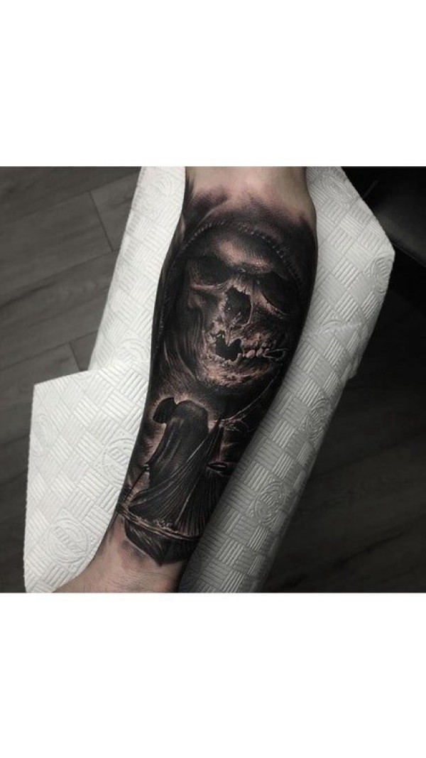 死神小臂纹身 男生小臂上黑灰色的死神纹身图片