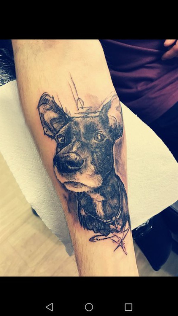 狗的纹身图案 男生小臂上黑灰色的小狗纹身图片