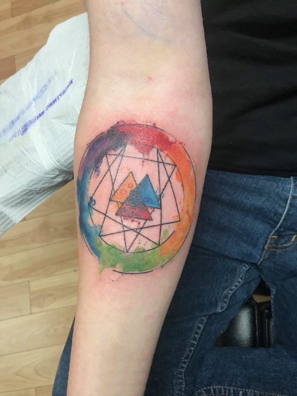 几何元素纹身 女生手臂上三角形和圆形纹身图片