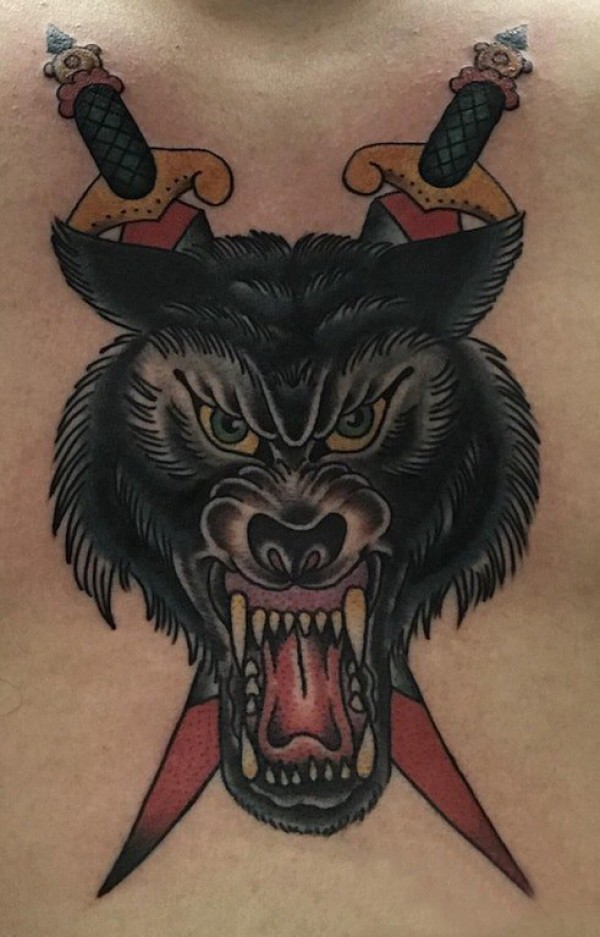 滴血狼头纹身 男生胸上狼头和匕首纹身图片