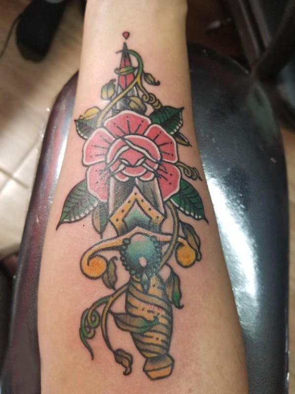 匕首纹身图案 女生小臂上匕首和花朵纹身图片