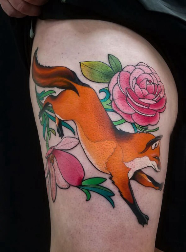百乐动物纹身 女生大腿上玫瑰和狐狸纹身图片