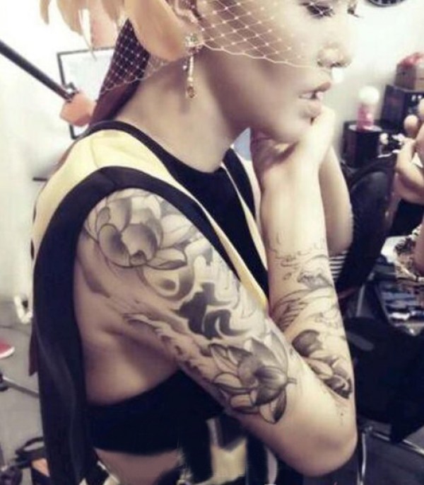谭维维纹身花臂 明星手臂上黑灰色的莲花纹身图片