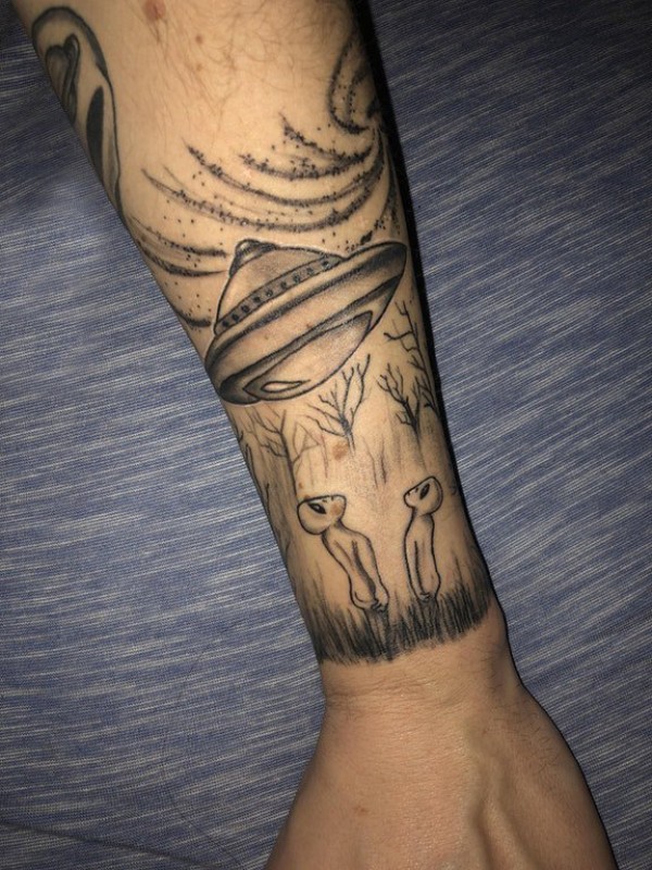 手臂纹身素材 男生手臂上外星人和飞碟纹身图片