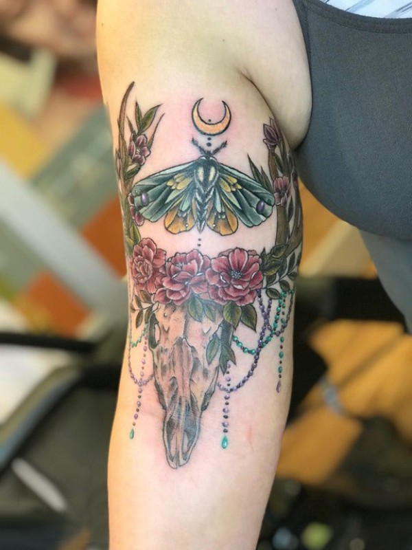 鹿头纹身图 女生大臂上鹿头和飞蛾纹身图片