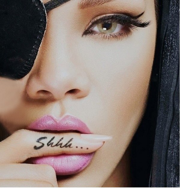 蕾哈娜手上纹身 明星手指上黑色的英文字母纹身图片