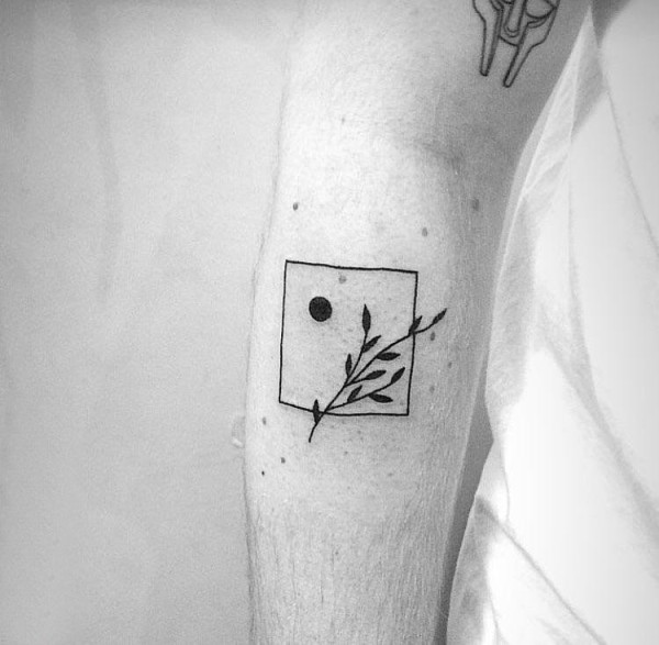 极简线条纹身 男生手臂上方形和植物纹身图片