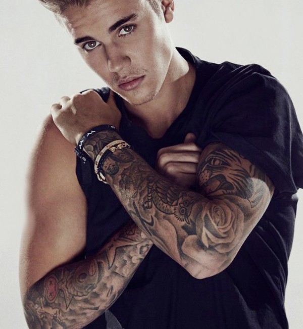 贾斯丁比伯纹身 明星手臂上花朵和动物纹身图片