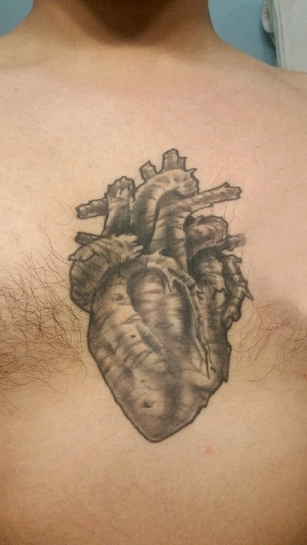 纹身图案胸部男 男生胸部黑色的心脏纹身图片