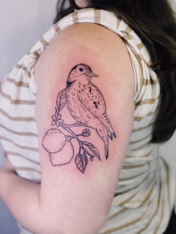 双大臂纹身 女生大臂上植物和小鸟纹身图片