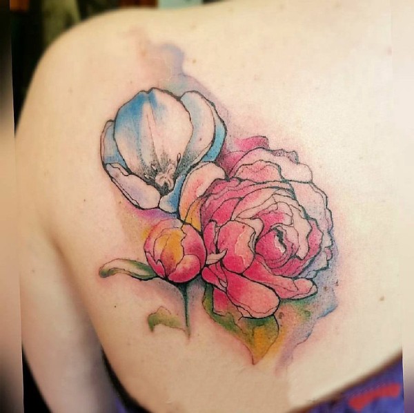 泼墨纹身素材 女生后背上彩色的花朵纹身图片
