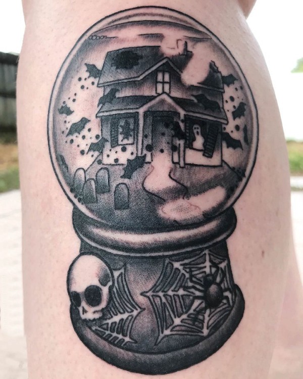 纹身黑色 男生大腿上建筑物的水晶球纹身图片
