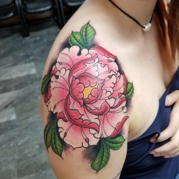 纹身牡丹花 女生肩部彩色的牡丹纹身图片