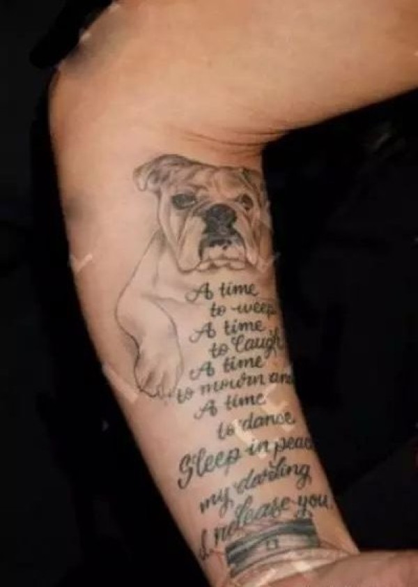 国际纹身明星 Pink小臂上狗和英文纹身图片
