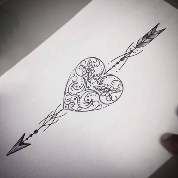 极简线条纹身 精致的心形和箭矢纹身手稿