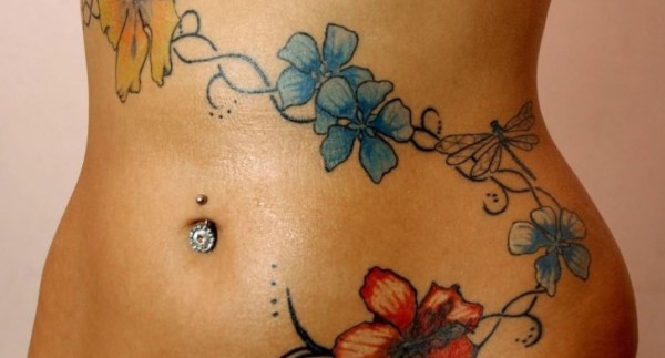 腹部 纹身图案 女生腹部彩绘的花朵纹身图片