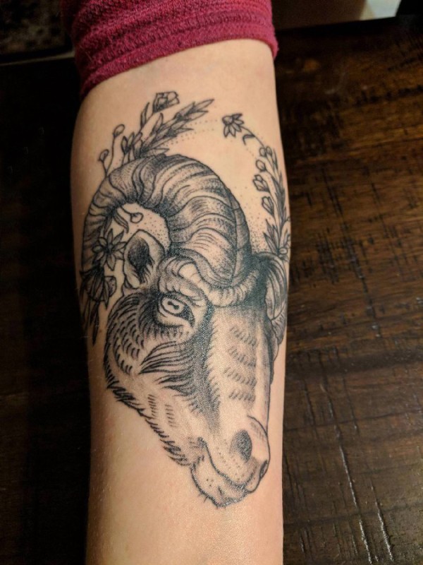 羊头纹身 男生手臂上植物和山羊头纹身图片
