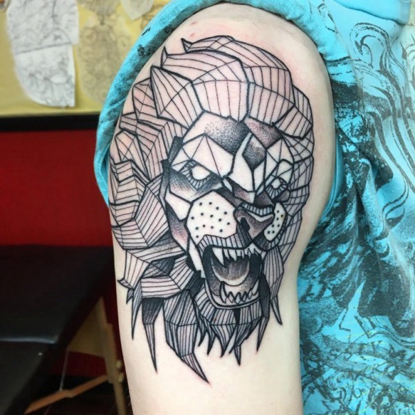 大臂纹身图 男生大臂上黑色的几何狮子纹身图片