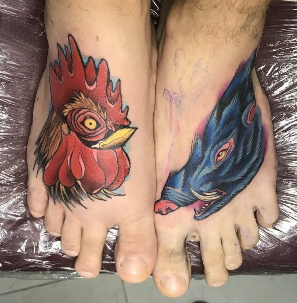 百乐动物纹身 女生脚背上鸡和野猪纹身图片