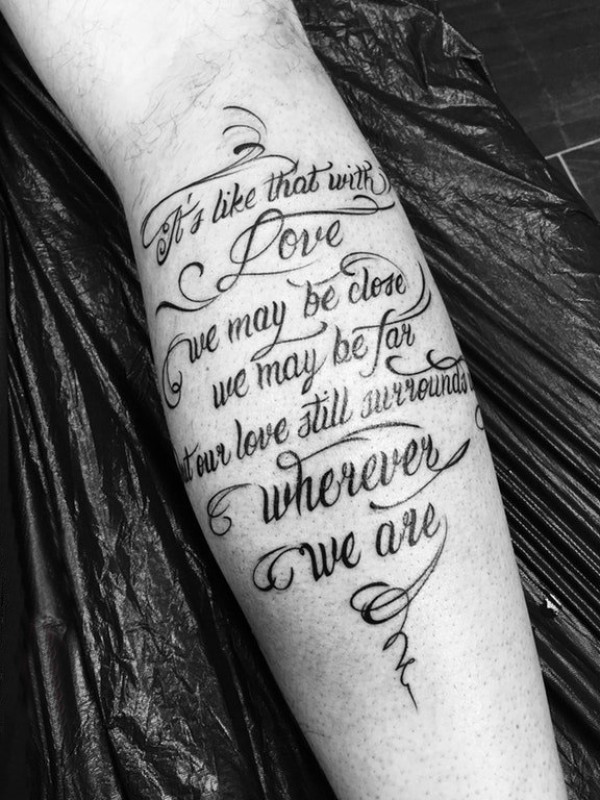 欧美小腿纹身 男生小腿上黑色的花体英文纹身图片