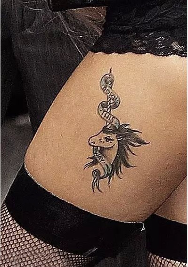 lady gaga的纹身 明星大腿上黑灰色的独角兽纹身图片