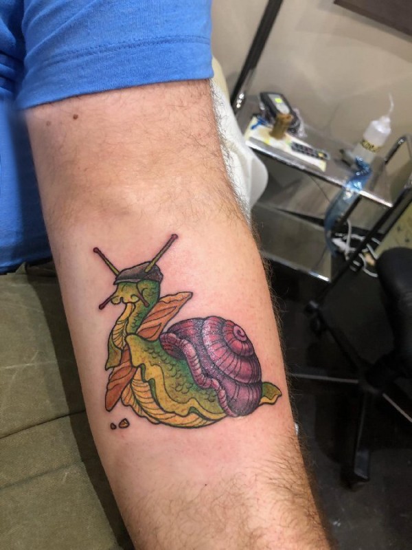 蜗牛纹身图案 男生手臂上彩色的蜗牛纹身图片