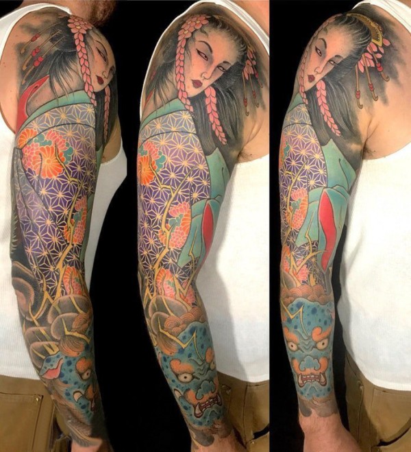 日本艺妓纹身花臂 男生手臂上彩色的艺妓纹身图片