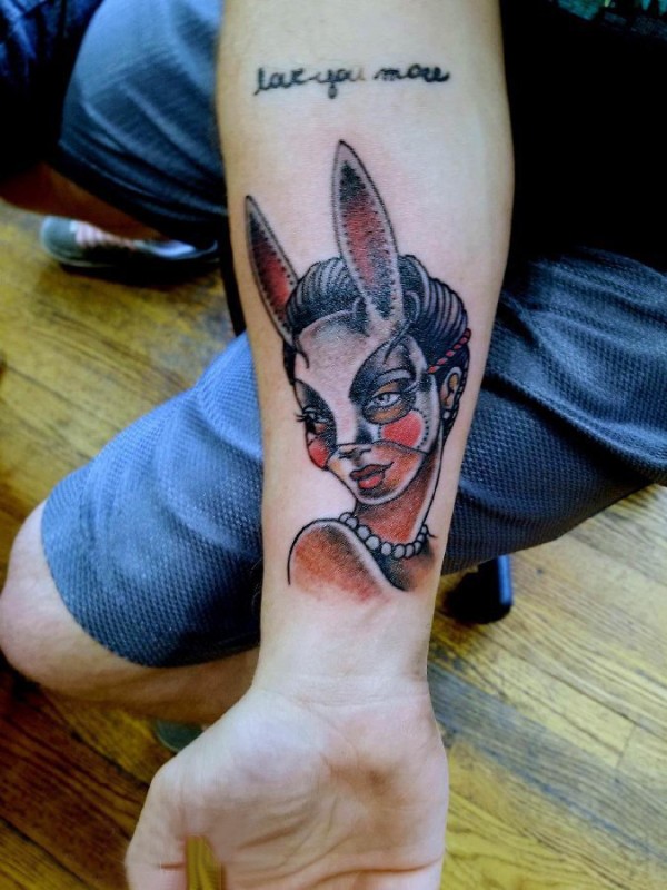 纹身小臂 男生小臂上兔子面具和人物纹身图片